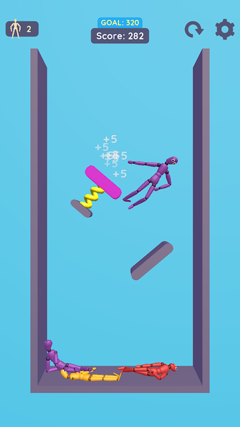 레벨을 진행하면서 장애물은 더 복잡해지며, 더미를 올바르게 던져 점수를 획득하기 위해 기술을 사용해야 합니다. 또한, 동일한 색상의 더미를 병합하여 다른 색상의 새로운 더미를 만들 수 있으며, 데미지를 증가시키고 추가 점수를 획득할 수 있는 새로운 기회를 제공합니다.